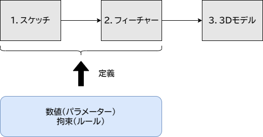 フィーチャーとは「スケッチという2次元の定義を、どのように3次元に変換するかを指定するルール」ということもできます。